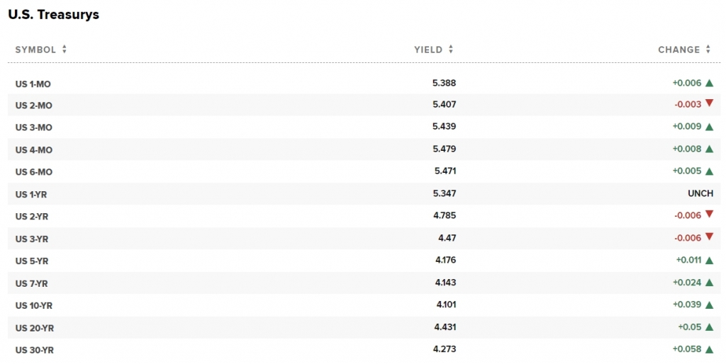이날 시장에서 10년물 금리는 전일보다 3.9bp 상승한 4.101%를 기록하고 있다. 20년물은 5bp 상승한 4.431%, 30년물은 5.8bp 오른 4.273%를 마크하고 있다. 하지만 단기물은 안전자산 선호심리의 영향으로 2년물 기준 0.6bp 하락한 4.785% 수준이다.