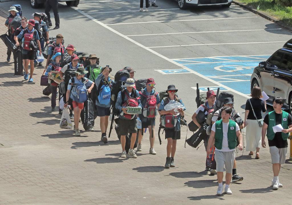 ![[용인=뉴시스] 김금보 기자 = 전북 새만금 야영지에서 철수한 세계스카우트잼버리 독일 대원들이 8일 오후 용인시 처인구 명지대학교에서 기숙사 입소를 위해 이동하고 있다. 2023.08.08.](https://thumb.mt.co.kr/cdn-cgi/image/f=avif/21/2023/08/2023080808283213944_1.jpg)