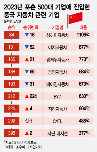 중국 자동차 산업의 성장도 눈여겨봐야 할 대목이다. 글로벌 500대 기업에 중국 자동차 관련기업이 9개나 진입하며 중국 자동차 산업의 성장을 드러냈다. 이중 다크호스는 단연 BYD와 CATL이다. BYD는 지난해 전기차 판매 급증에 힘입어 630억달러의 매출액을 기록하며 212위를 기록했다. 무려 224계단 상승한 것으로 중국 기업 중 가장 높은 상승폭을 기록했다. CATL은 매출액 488억달러로 처음 500대 기업에 진입하면서 단숨에 292위를 차지했다.