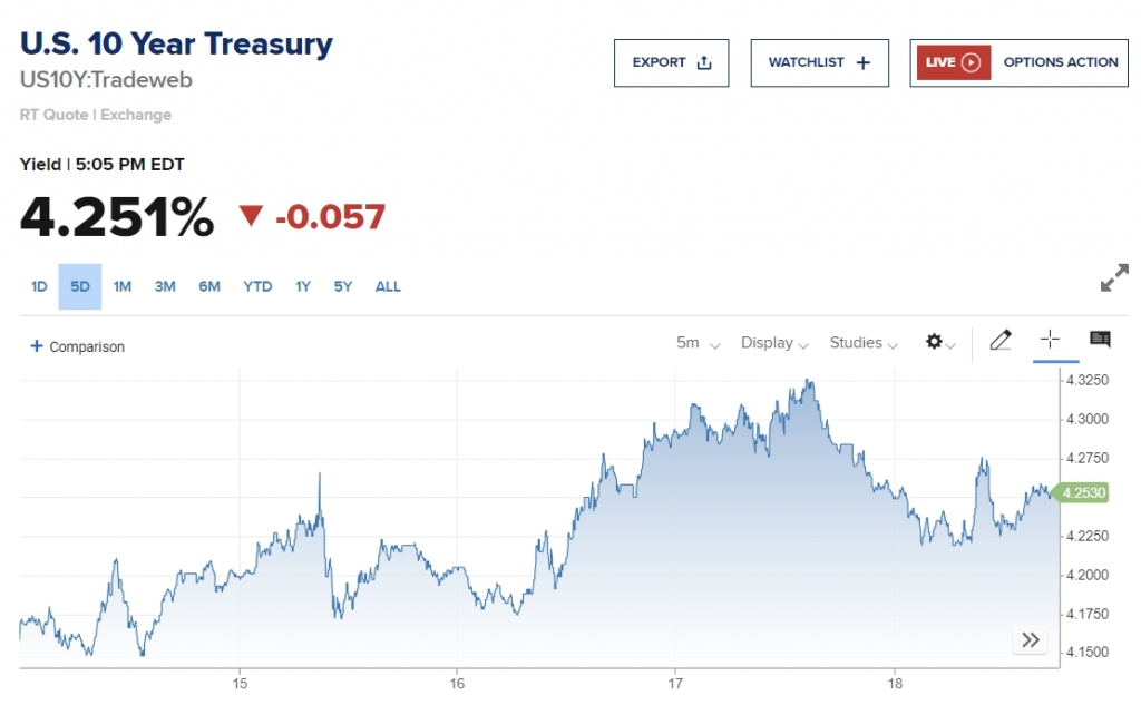 전일 10년 만기 미국 국채 수익률은 2008년 금융위기 이후 15년 만에 최고 수준인 4.38%까지 상승하면서 시장에 우려를 더했다. 하지만 이날 10년물 금리는 전일대비 5.7bp 하락하면서 4.251%를 유지하고 있다.
