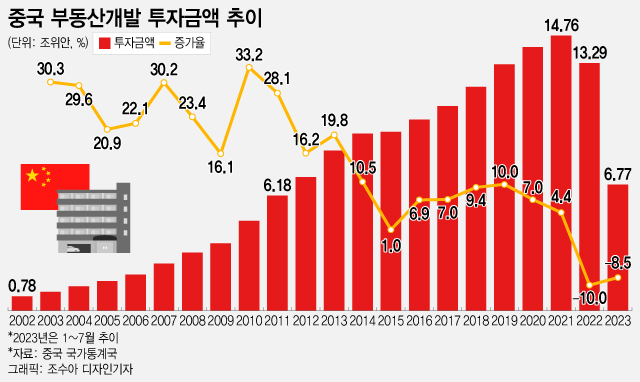 지난해 중국 부동산개발 투자금액은 전년 대비 10% 감소한 약 13조2900억위안(약 2392조원)을 기록했다. 중국 부동산개발 투자금액이 감소한 건 1999년 집계 이후 처음이다.