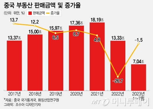 올해 1~7월 중국 부동산 판매금액도 작년 대비 1.5% 줄어든 7조400억위안(약 1267조원)으로 제대로 된 반등을 보여주지 못하면서 부동산업체의 유동성 위기를 부추겼다. 이 여파가 바로 컨트리가든의 디폴트 위기다.