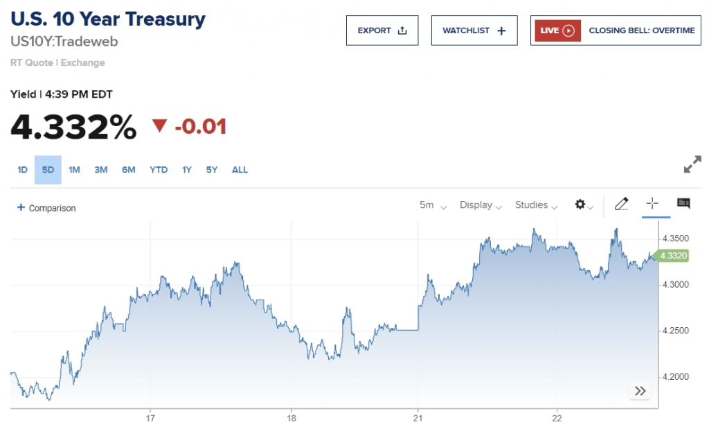 국채시장에선 10년물 금리가 전일보다 1.4bp 떨어진 4.328%를 나타내고 있다. 10~30년물 장기채 금리는 최대 4.8bp까지 하락(가격상승)했고, 나머지 중단기물은 0.1~4.9bp 사이에서 상승(가격하락)했다.