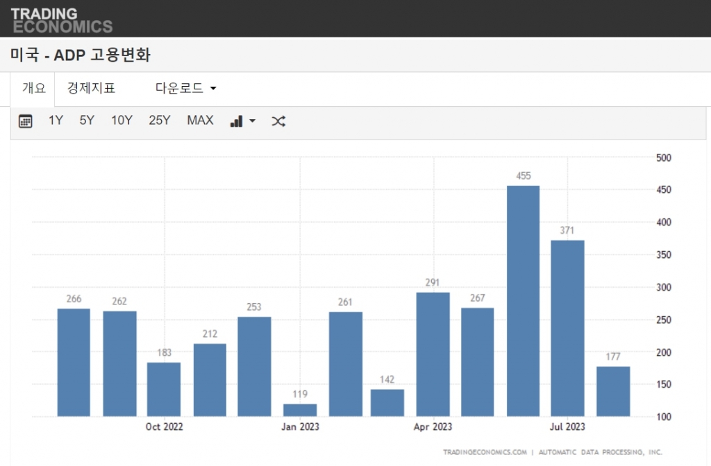 활활 타오르던 미국 노동시장도 점점 식어가고 있다. 8월 비농업 부문 민간고용 숫자가 전월비 17만 7000명 늘어나는 데 그쳤다. 이날 민간 조사기관인 ADP(Automatic Data Processing)에 따르면 8월 증가수는 17만 7000명으로 7월의 32만 4000명에 비해 반토막이 났다. 전문가 예상치가 19만 5000명이었던데 비해서도 2만명 가까이 모자른 결과다.
