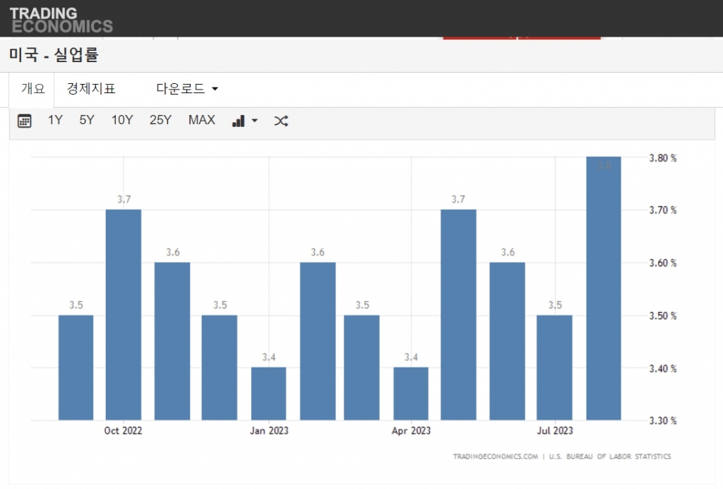 사상최저치이던 미국의 실업률이 결국 고금리를 견디지 못하고 상승하기 시작했다. 지난 8월 수치는 역대 최저수준이던 3.5%에서 0.3%p 상승한 3.8%를 기록했다. 이날 미국 노동부 고용통계국은 8월 비농업부문 일자리가 18만 8000건을 기록해 전망치인 17만건을 웃돌았다고 밝혔다. 전월 15만 5000건에 비해서도 2만 4000건 늘어난 것이다. 올들어 6월에 8만 6000건으로 최저치를 찍었던 일자리 증가수는 5월에 25만 5000건까지 상승했다가 6월에 소강상태를 보인 후 두달 연속증가세를 보이고 있다.