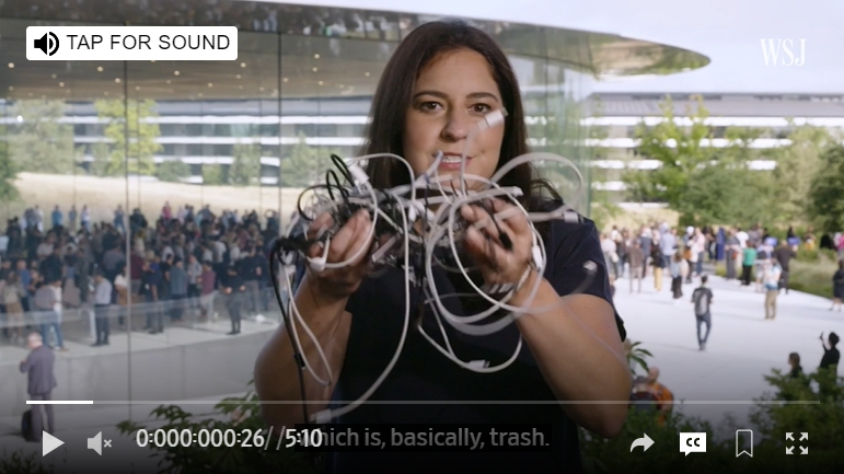 컨셉을 '애국보수 퍼포먼서'로 삼은 것 같다. 2019년 갤럭시 폴드에 소시지를 끼워넣고, 이듬해 갤럭시S10을 아이스박스에 넣은 월스트리트저널(WSJ)의 테크 칼럼니스트 조안나 스턴이 이번엔 애플의 라이트닝 코드 더미를 창밖으로 내던졌다.