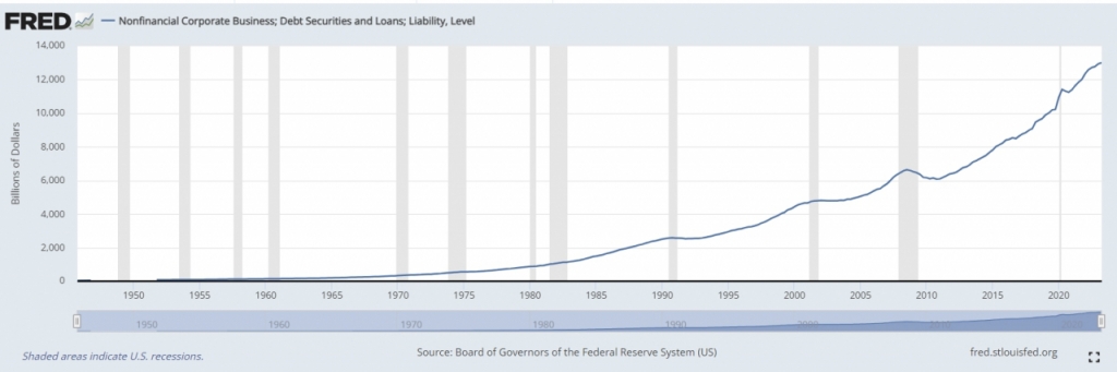 울프는 2024년 만기가 도래하는 미국 기업 부채(금융회사 제외) 9030억 달러라고 지적했다. 이는 2023년 2040억 달러보다 343% 증가한 수치다. 기업부채는 2025년에 전년비 42% 증가한 1조 2800억 달러, 2026년에는 15% 증가한 1조 4700억 달러가 될 전망이다.