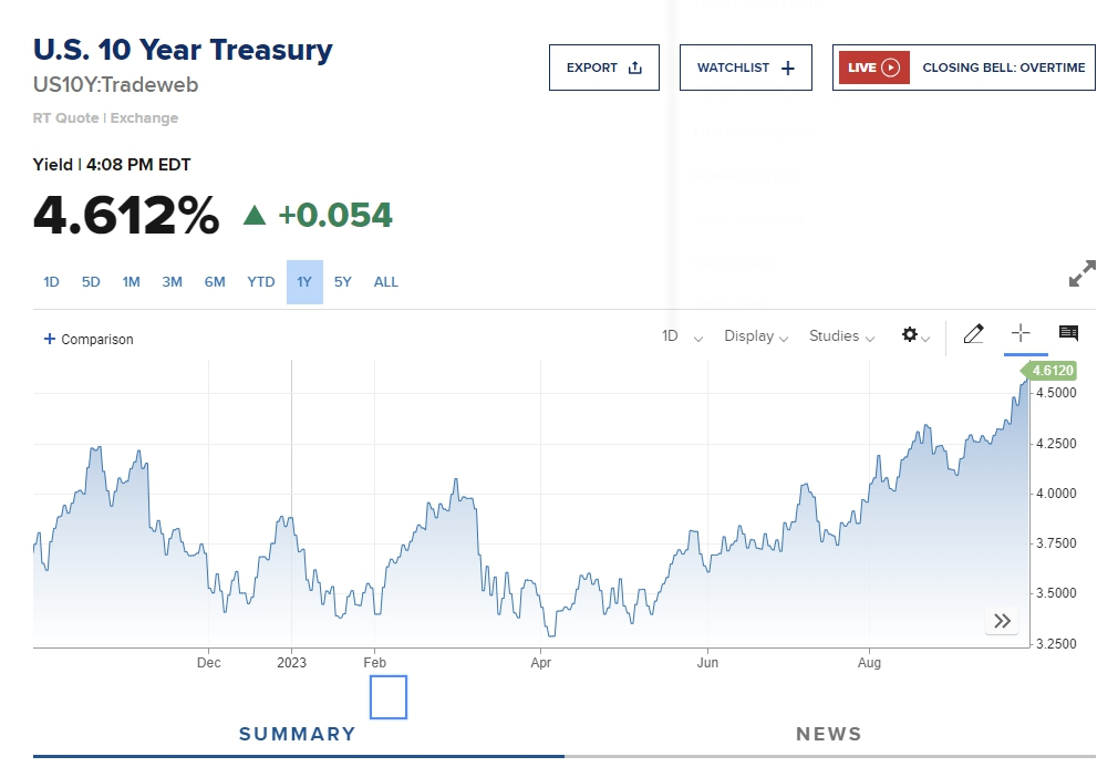 뉴욕증시가 국채금리 급등과 유가상승으로 인해 투자심리가 위축되면서 혼조세를 기록했다. 국채시장에서 벤치마크인 10년물 금리는 전 거래일보다 5bp 안팎 올라 4.6%를 돌파했다. 전문가들은 10년물 수익률이 올해 말까지 5%에 다다를 수 있다고 내다봤다.