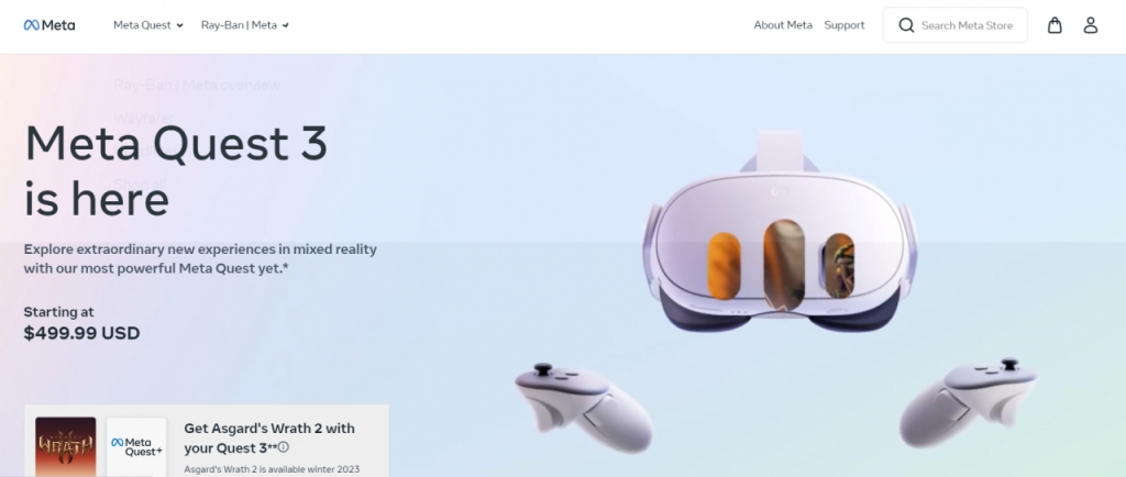 메타 플랫폼은 이날 최신 VR(가상현실) 헤드셋인 퀘스트3를 내놓았다. 499달러부터 시작하는 이 기기는 이전 제품보다 200달러 더 비싸지만 퀄컴의 강력한 칩과 더 나은 화면을 가졌다. 퀘스트3는 애플이 만든 경쟁작인 비전 프로의 핵심 기능인 '패스스루' 기능을 포함하고 있다. 앱에서 헤드셋의 아무 부분이나 두 번 탭하면 가상 세계에서 벗어나 패스스루 모드로 들어간다.