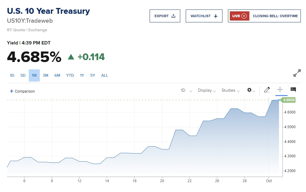 이날 국채시장에서 채권 수익률은 투자자들이 안전자산을 매도하면서 다시 급등세를 보였다. 10년물 금리는 전거래일 대비 12bp나 급등한 4.691%을 기록했다. 10년물 금리는 장중 한때 4.7%를 넘기기도 했다.