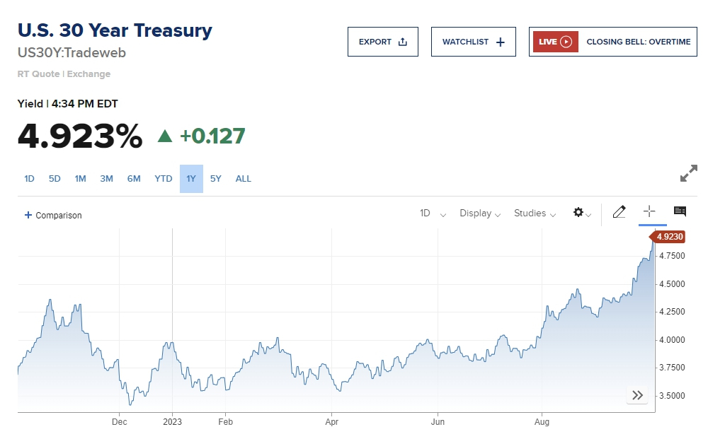 미국 채권시장에서 국채 수익률이 급등(가격하락)하면서 뉴욕증시가 급락했다. 10년물 국채금리는 전거래일보다 하루 만에 12.3bp 치솟아 금융위기 당시인 16년 수준인 4.8%를 넘어섰다. 20년물은 이미 5%를 넘어서 5.12%에 달하고 있다.
