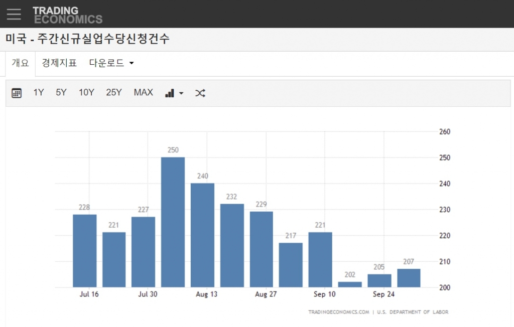이날 9월 마지막주 실업수당 청구건수는 20만 7000건으로 전주보다 2000건 증가한 것으로 집계됐다. 다우존스 컨센서스 추정치 21만건에 비해 근소한 차이다. 투자자들은 아이러니하게도 실업수당 청구건수가 늘기를 바랐지만 노동시장은 탄탄하다는 것을 증명했다.