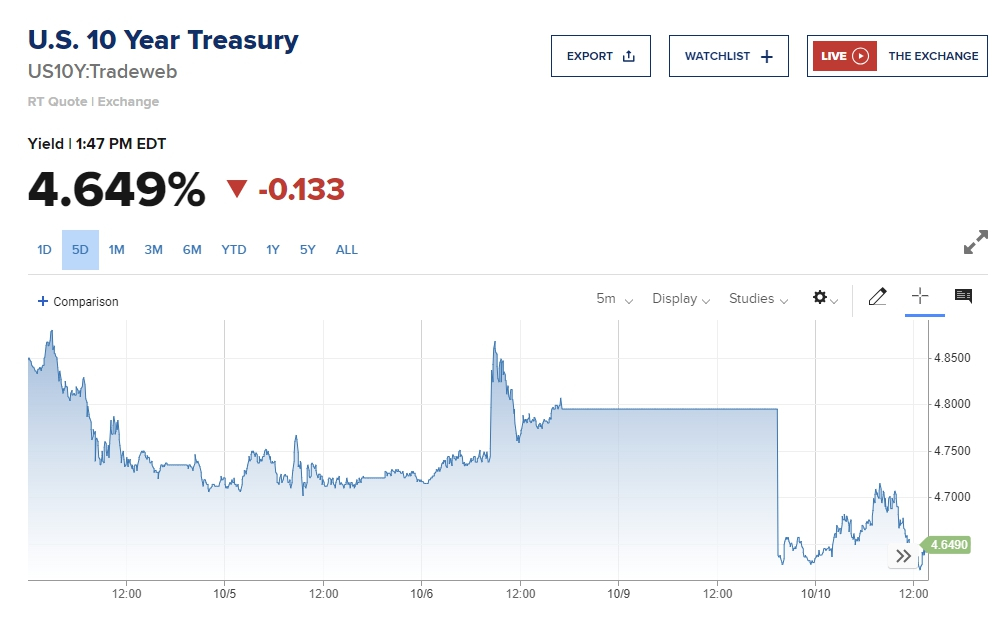 이날 미국 국채금리는 크게 하락했다. 이스라엘과 팔레스타인 전쟁이 주요 변수로 안전자산 투자매력을 높이면서 다시 유동성이 미국으로 집중된 것이다. 이날 국채시장에서 벤치마크 10년물 금리는 전거래일보다 13bp 이상 급락한 4.6%대를 기록했다. 10년물 금리는 최근 4.8%대 후반까지 치솟았다가 고점 논란 후 10bp 가량 후퇴했는데, 연휴 기간 사이에 중동의 화약고에서 반세기만의 대규모 테러로 전쟁이 발발하면서 결과적으로 크게 밀리기 시작했다는 분석이다.