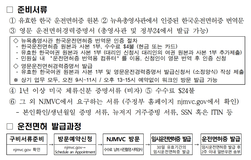준비서류는 첫째 유효한 한국 운전면허증 원본(물리적 손실이 없어야 함)과 둘째 뉴욕총영사관에서 인증된 한국운전면허증 번역문, 셋째 영문 운전면허경력증명서(총영사관 및 정부24에서 발급 가능), 넷째 1년 이상 미국 체류신분 증명서류 (비자) 등이다. 여기에 수수료로 24달러가 든다.