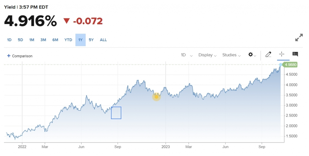 이날 벤치마크인 10년 만기 국채 수익률은 16년 만에 처음으로 5%를 넘어섰다. 10년물 금리는 주택 모기지와 신용카드, 자동차 대출 등에 대한 기준 금리로 쓰인다. 때문에 경제 전반에 대한 파급력을 가지고 있다.