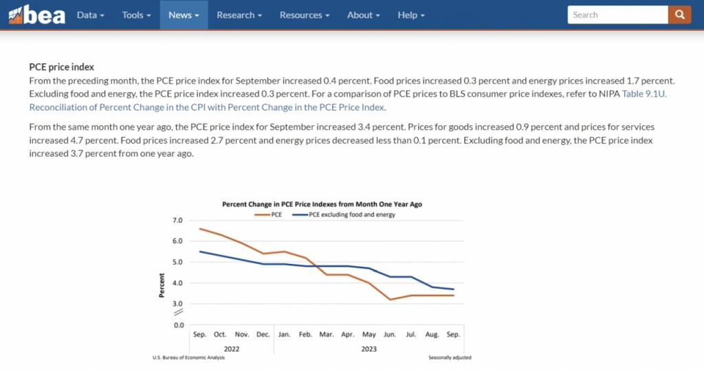 이날 미국 상무부는 지난 9월 개인소비지출(PCE) 물가지수가 3.4%(전년비)를 기록해 전월과 동일한 수준을 보였다고 밝혔다. 전월비로는 0.4% 상승한 것으로 둘 다 예상치에 부합했다.