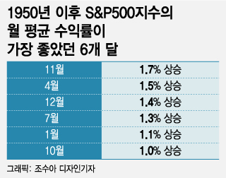 주식 투자자 연감(Stock Trader's Almanac)에 따르면 S&P500지수는 1950년 이후 11월에 평균 1.7% 상승해 1년 중 수익률이 가장 좋았다. 그 다음으로는 4월이 1.5%의 수익률로 2번째로 좋았고 12월이 1.4%의 수익률로 그 뒤를 이었다.