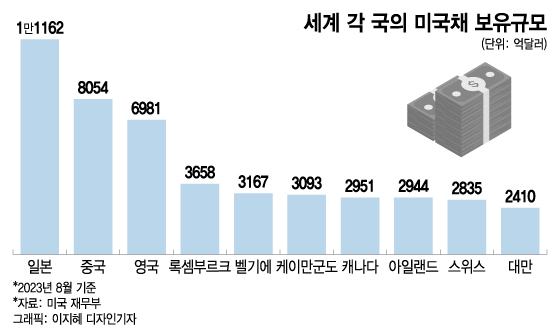 중국의 미국 국채 보유 규모는 2019년만 해도 1위였으나 계속해서 국채를 팔면서 일본에 이어 2위로 하락했다. 지난 8월말 기준, 일본이 1조1162억달러로 1위를 차지했으며 중국은 8054억달러로 2위다. 3위 영국(6981억달러)보다는 1073억달러 많은 규모다.