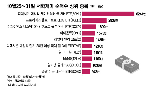 미국 증시가 단기 바닥에 도달해 막 반등을 시작하려던 지난 10월25~31일 사이에 서학개미들이 가장 많이 순매수한 종목은 각각 ICE 반도체지수와 나스닥100지수의 하루 수익률을 3배 추종하는 디렉시온 데일리 세미컨덕터 불 3배 ETF(SOXL)와 프로셰어즈 울트라프로 QQQ ETF(TQQQ)였다.