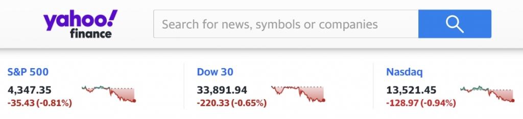9일(현지시간) 뉴욕증시에서 다우존스(DJIA) 지수는 전일보다 220.33(0.65%) 내린 33,891.94를 기록했다. S&P 500 지수도 35.43포인트(0.81%) 하락한 4,347.35에 거래를 마쳤다. 나스닥은 128.97포인트(0.94%) 빠져 지수는 13,521.45에 마감했다.