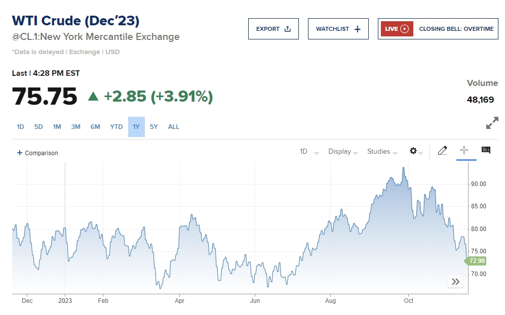 배럴당 70달러 중반으로 내려갔던 유가가 4% 가까이 급반등했다. 1월 브렌트유 선물 가격은 전거래일보다 3달러 넘게 오른 배럴당 80.49달러를 기록하고 있다. 서부 텍사스산 중질유(WTI)는 2.8달러 상승한 배럴당 75.73달러를 나타냈다.