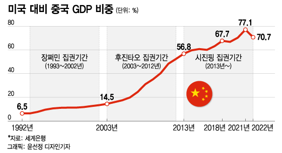 지난 2021년 미국 대비 중국 국내총생산(GDP) 비중은 77.1%로 최고치를 찍었다. 2003년 중국 GDP는 미국의 14.5%에 불과했지만, 불과 18년 만에 미국 경제의 4분의 3 수준으로 급성장한 것이다. 하지만, 다음 해인 2022년 중국 GDP는 미국의 70.7%로 오히려 감소했다.