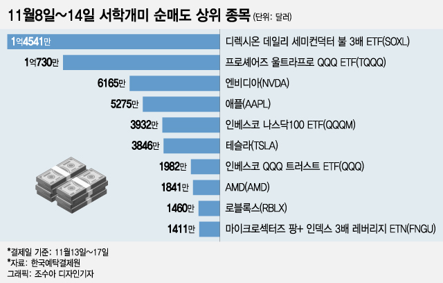 서학개미들이 지난 8~14일 증시가 오르는 동안 가장 많이 순매도한 종목은 ICE 반도체지수의 하루 수익률을 3배 추종하는 디렉시온 데일리 세미컨덕터 불 3배 ETF(SOXL)와 나스닥100지수의 하루 수익률을 3배 추종하는 프로셰어즈 울트라프로 QQQ ETF(TQQQ)였다.