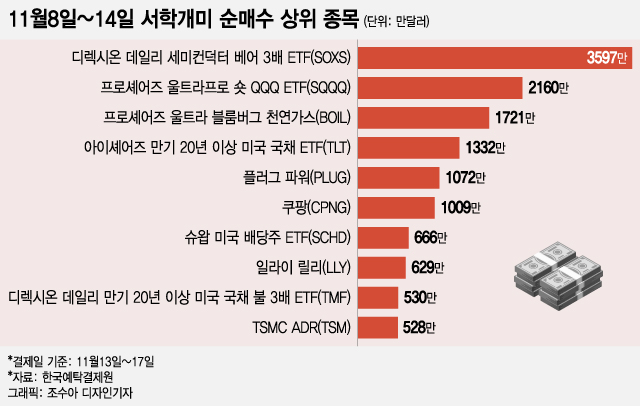 서학개미들은 ICE 반도체지수의 하루 수익률을 반대로 3배 추종하는 디렉시온 데일리 세미컨덕터 베어 3배 ETF(SOXS)를 3597만달러, 나스닥100지수의 하루 수익률을 반대로 3배 추종하는 프로셰어즈 울트라프로 숏 QQQ ETF(SQQQ)를 2160만달러 순매수했다.