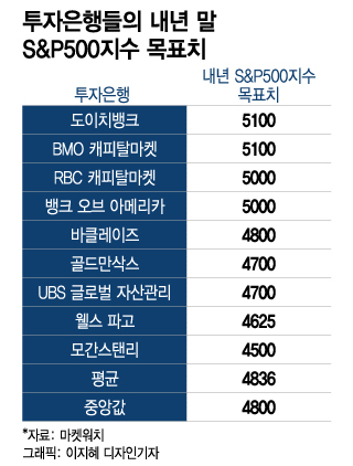 S&P500지수가 내년에 오르긴 올라도 지난해 1월 초에 기록한 사상최고치 4796보다는 낮은 수준에서 한 해를 마감할 것이란 전망도 투자은행 3곳에서 나왔다.