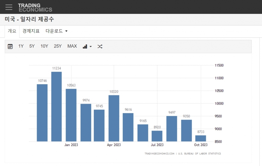 미국 10월 채용건수가 873만건으로 전월에 비해 61만 7000건(6.6%) 감소한 것으로 나타났다. 타이트했던 미국 고용시장의 수급이 느슨해지고 있다는 분석이다.