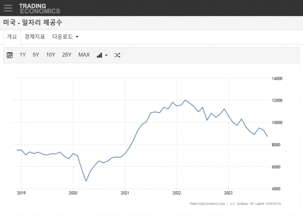 미국의 신규채용건수는 코로나19 팬데믹 시기인 2020년 초 400만건 초반까지 떨어졌다가 점진적으로 상승해 전염병 위기가 실질적으로 가신 지난해 초 1200만건까지 급증했다. 이후 금리인상과 함께 하락세를 탄 채용건수는 올초 1000만건 이하로 떨어졌고 이제는 하락세가 완연하게 드러나고 있다. 고금리에도 버티던 노동시장의 수요가 점점 힘을 잃어가고 있다는 지적이다.