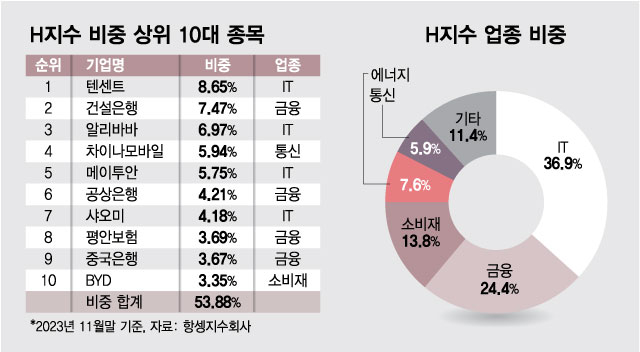 H지수에 IT 비중이 높은 것도 부담이다. 지난 11월말 기준 H지수 비중 상위 1~5위는 텐센트(8.65%) 건설은행(7.47%) 알리바바(6.97%) 차이나모바일(5.94%) 메이투안(5.75%)으로 IT기업이 세 곳, 금융회사가 두 곳이다.