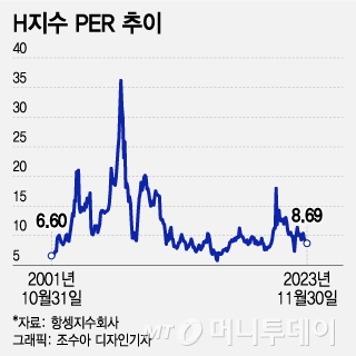 H지수를 비롯한 홍콩증시가 이제 바닥권에 접근했다는 분석도 나온다. 11월말 기준 H지수의 주가수익비율(PER)은 8.69배로 2007년 10월 기록한 사상 최고치인 36배의 4분의 1, 2021년 3월 기록한 18배의 절반에도 미치지 못하는 수준이다.