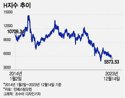 당장 H지수가 반등하긴 어렵겠지만, 내년 H지수가 '전저후고(前低後高)' 양상을 보일 것이라는 전망도 제기됐다. 중국 투자은행(IB) CCB인터내셔널은 지난 4일 발표한 '2024년 홍콩증시 투자전망: 회복을 위한 숨고르기'에서 "만약 올해 말 항셍지수가 1만9781.41을 하회하면 홍콩증시는 사상 최초로 4년 연속 하락한다"며 "중장기적으로 저점에 가까워지고 있다"고 분석했다.