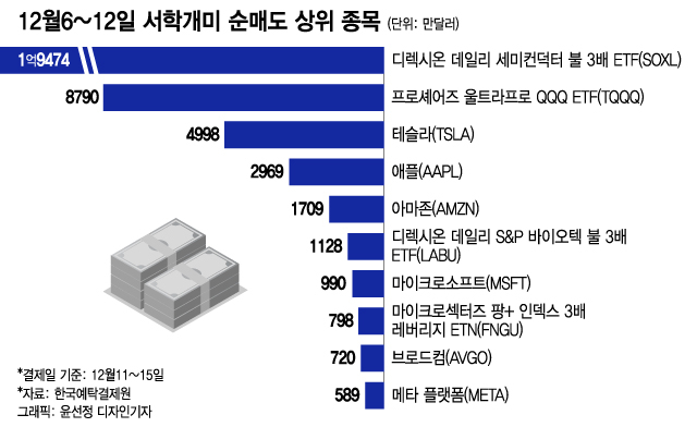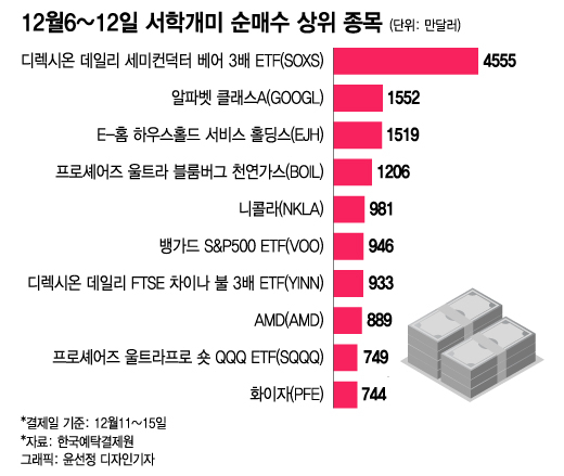 반면 서학개미들의 순매수는 반도체주 3배 인버스 ETF에 집중됐다. 서학개미들은 ICE 반도체지수의 하루 수익률을 반대로 3배 추종하는 디렉시온 데일리 세미컨덕터 베어 3배 ETF(SOXS)를 4555만달러 순매수했다.