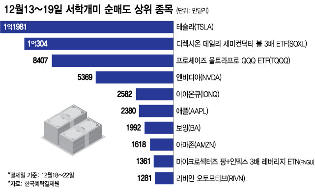 기술주 3배 레버리지 ETF에 대한 순매도도 계속됐다. 서학개미들은 ICE 반도체지수의 하루 수익률을 3배 추종하는 디렉시온 데일리 세미컨덕터 불 3배 ETF와 나스닥100지수의 하루 수익률을 3배 추종하는 프로셰어즈 울트라프로 QQQ ETF(TQQQ)를 각각 1억304만달러와 8407만달러 순매도했다.