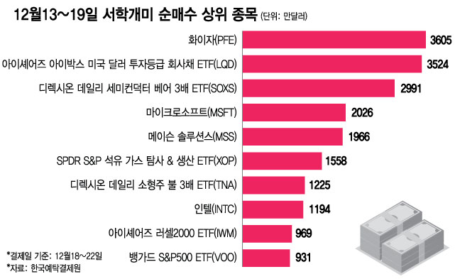 서학개미들은 아이셰어즈 아이박스 미국 달러 투자등급 회사채 ETF(LQD)를 3524만달러 순매수했다. 연준이 내년에 금리를 인하하면 회사채 수익률이 떨어질 것으로 전망해 투자한 것으로 보인다.