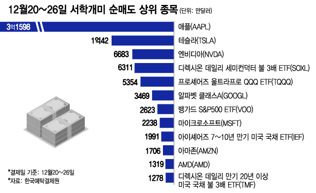 예를 들어 이 기간 동안 서학개미들이 가장 많은 3억1598만달러를 순매도한 애플은 지난해 12월14일 198.11달러로 종가 기준 사상최고치를 기록한 뒤 26일 193.05달러로 마감해 2.5%가량 하락했다.
