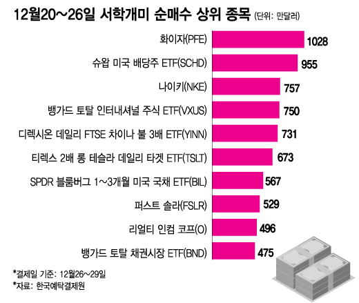 반면 지난해 12월20~26일 사이에 서학개미들의 순매수는 극히 저조했다. 순매수 규모가 1000만달러를 넘는 종목이 화이자 단 하나뿐이었다. 화이자는 지난해 43.8% 급락해 서학개미들이 저가 매수 차원에서 접근하고 있는 것으로 보인다.