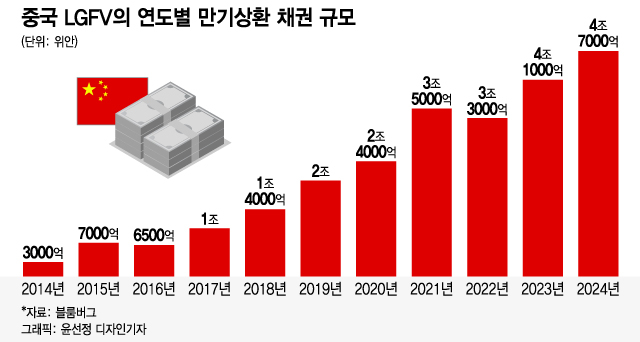 중국 LGFV의 연도별 만기상환 채권 규모는 2014년 약 3000억위안에서 2024년 약 4조7000억위안으로 15배로 불어났다.