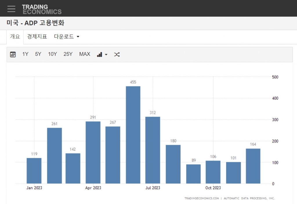 이날 미국 고용정보사인 ADP(Automatic Data Processing)은 지난 12월 민간기업 고용 일자리가 전월비 16만 4000개 늘었다고 밝혔다. 다우존스 예상치인 13만건을 26%나 상회하는 결과로 상당한 증가세로 받아들여진다.