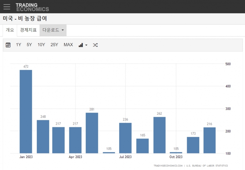 12월 실업률은 3.7%로 전월과 동일한 수준을 유지했고 실업자수는 630만명을 기록했다. 전년 같은 기간 실업률은 3.5%, 570만명으로 12월 수치는 고금리 지속에도 불구하고 미국 경제에서 노동수요가 꺾이지 않고 있다는 사실을 증명했다. 12월 평균 시간당 임금은 0.4% 증가했고, 전년비로는 4.1% 늘어 각각 당초 예상치(0.3%, 3.9%)보다 높았다.