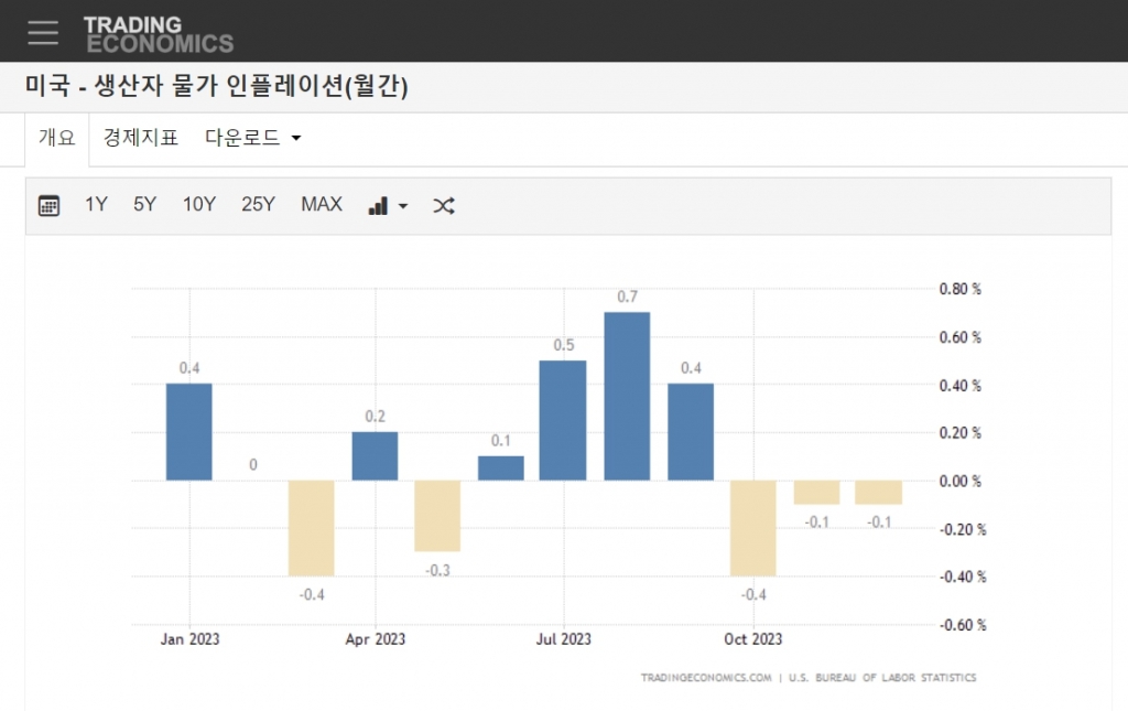 미국 소비자물가의 선행지표인 생산자물가지수(PPI)가 지난 12월에 전월대비 0.1% 하락한 것으로 집계됐다. 3개월째 하락세로 연초 물가전망을 밝게 하는 지표다. 이날 미국 노동부 통계국은 지난 12월 PPI가 전월비 0.1% 하락해 10월 -0.4%, 11월 -0.1%에 이어 3개월째 하락세를 나타냈다고 밝혔다. 당초 전문가 예상치는 전월비 0.1% 상승이었는데 오히려 그만큼 더 줄어든 셈이다.