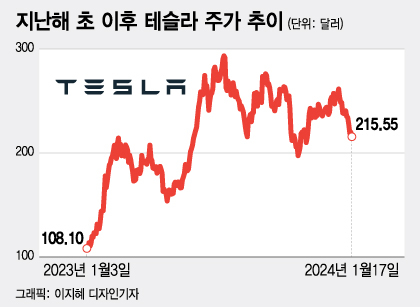 테슬라 주가는 17일(현지시간) 2% 가까이 하락한 215.55달러로 마감했다. 테슬라는 올들어 11거래일 중 2거래일을 제외한 9거래일 동안 주가가 내려가며 총 13.3% 떨어졌다. 이는 올들어 1% 하락한 나스닥지수에 비해 극히 저조한 수익률이다.