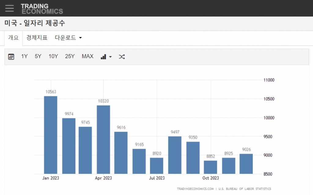 미국 노동수요는 지난 12월에도 견조하게 유지됐다. 이날 미국 노동부는 지난 12월 일자리 제공수가 902만 6000개로 11월 892만 5000개보다 10만개가량 증가했다고 밝혔다. 최근 한분기 동안 일자리는 계속 늘고 있다.