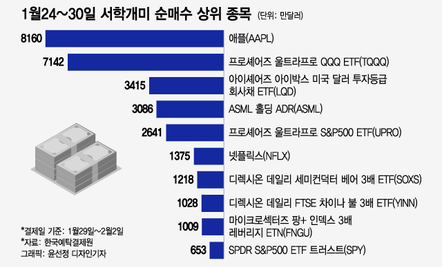 한국예탁결제원에 따르면 서학개미들은 지난 1월24일~30일(결제일 기준 1월29일~2월2일) 사이에 미국 증시에서 4억1639만달러를 순매수했다.