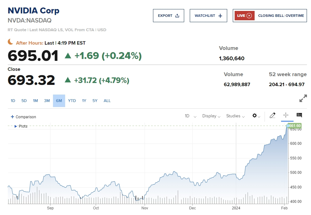 뉴욕증시가 금리인하 시기 후퇴전망과 함께 하락세를 기록했다. 국채수익률이 오르면서 그간 사상최고치를 경신했던 지수는 차익실현 명분을 얻었다. 그러나 엔비디아는 골드만삭스의 목표주가 상향(625달러→800달러)으로 4.77% 상승하면서 주당 693.18달러를 기록해 사상최고가를 경신함과 동시에 700달러대를 목전에 두게 됐다.
