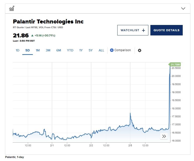 50파크 인베스트먼트의 아담 사르한 최고경영자(CEO)는 "3월 금리 인하에 대한 희망을 제롬 파월 연방준비제도(Fed) 의장이 무너뜨렸지만 시장은 파월의 발언을 앞뒤로 바꾸려고 노력하고 있다"고 말했다. 이날 팔란티어 테크놀로지스는 4분기 매출이 급등하면서 주가도 30% 넘게 튀어올랐다. 스포티파이도 실적이 기대치를 뛰어넘었고, 프리미엄 가입자가 증가하면서 6% 이상 상승했다.