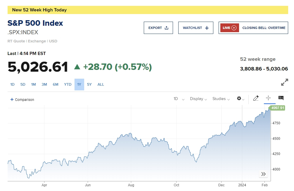 뉴욕증시에서 기술주가 나흘째 랠리를 이어가면서 나스닥 지수와 S&P 500 지수를 다시 최고치로 끌어올렸다. S&P 지수는 종가 기준으로 사상 최초로 5000선을 돌파했다.