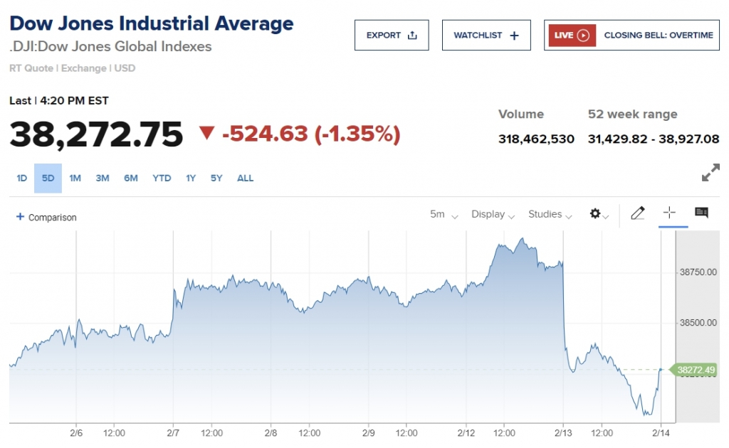 13일(현지시간) 뉴욕증시에서 다우존스 지수는 전일보다 524.63(1.35%) 내린 38,272.75를 기록했다. S&P 500 지수도 68.67포인트(1.37%) 하락한 4,953.17에 거래를 마쳤다. 나스닥은 286.95포인트(1.8%) 내려 지수는 15,655.6에 마감했다.